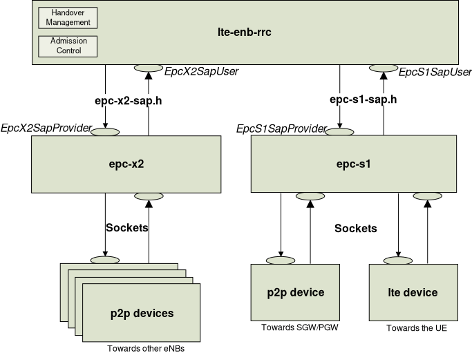 The main objective of the EPC model is to provides means for the simulation of end-to-end IP connectivity over the LTE model. To this aim, it supports for the interconnection of multiple UEs to the Internet, via a radio access network of multiple eNBs connected to the core network, as shown in Figure Overview of the LTE-EPC simulation model.