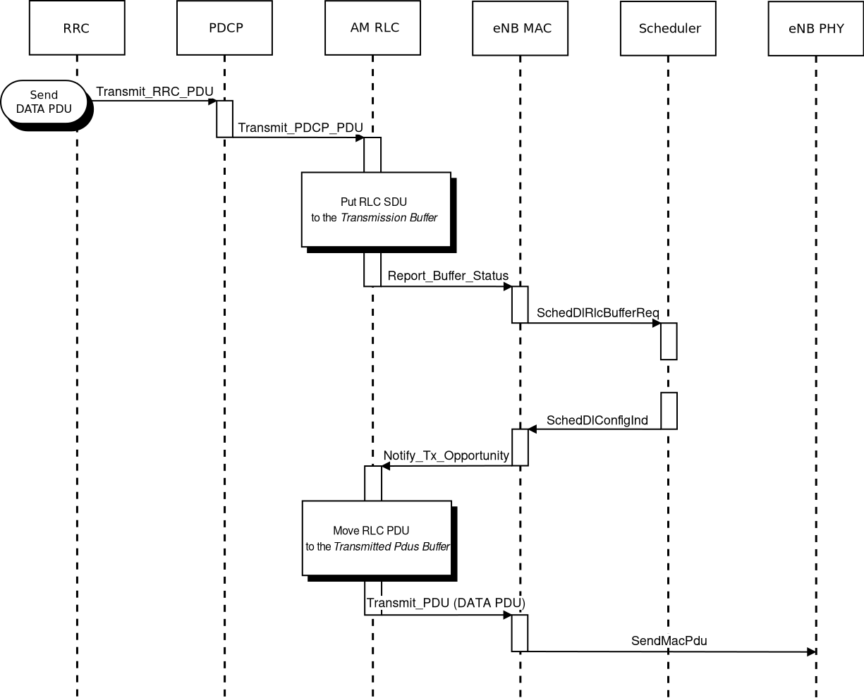 The model is to be used to simulate the transmission of IP packets by the upper layers. With this respect, it shall be considered that in LTE the Scheduling and Radio Resource Management do not work with IP packets directly, but rather with RLC PDUs, which are obtained by segmentation and concatenation of IP packets done by the RLC entities. Hence, these functionalities of the RLC layer should be modeled accurately.